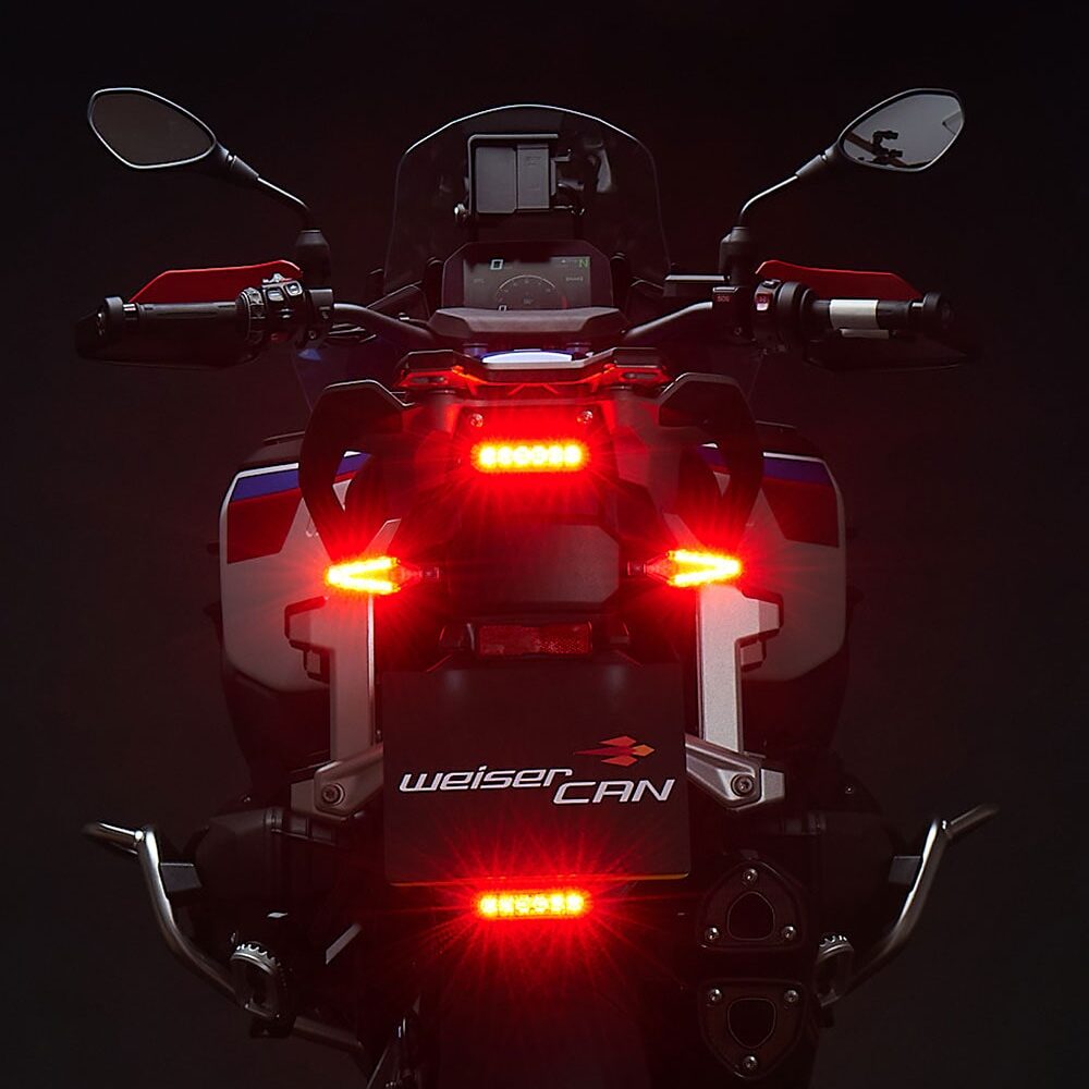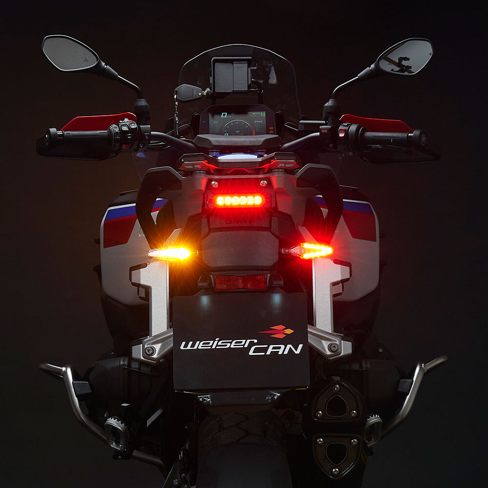 With WeiserCAN, you can run two sets of front turn signals at the same time—in both the handguard and Enduro positions—either as running lights or as turn signals (see photo). You can also operate your OEM handguard lights together with Weiser dual-function front lights, giving you white DRLs and amber turn signals running simultaneously.